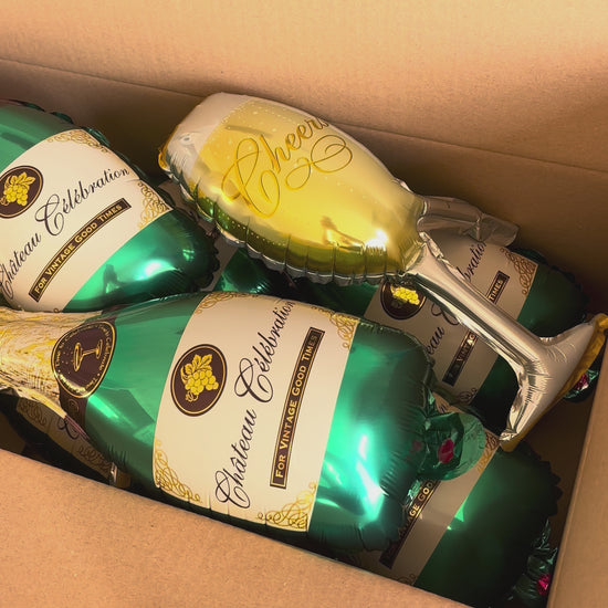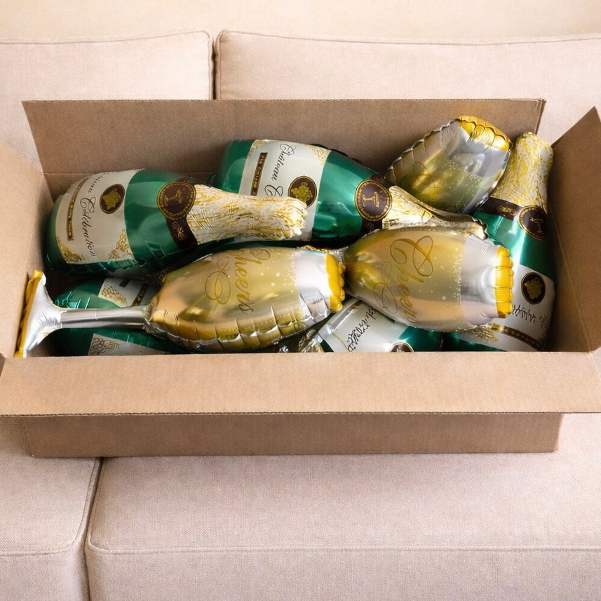 Une box entièrement remplie de ballons bouteilles et coupes de champagne, pensée pour créer un effet waouh immédiat dès l’ouverture.