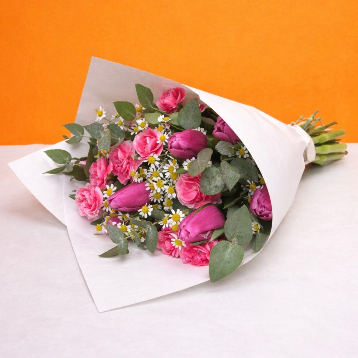 Nos bouquets sont composés de fleurs fraîches et de saison, sélectionnées avec soin pour leur qualité et leur tenue.