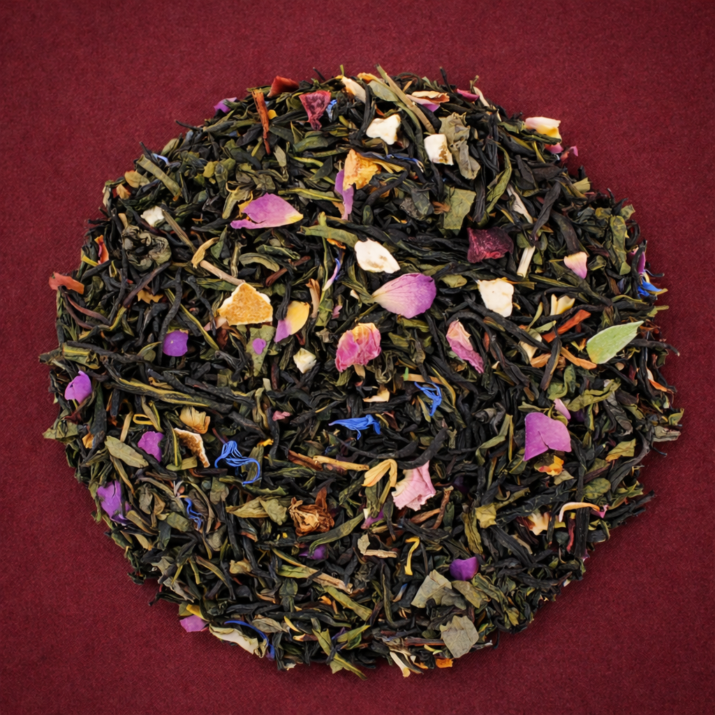 Sur une base de thé vert gunpowder, de thés verts sencha, dont l’un subtilement parfumé aux fruits de la passion, et d’un earl grey aux notes de bergamote, ce thé libère des arômes élégants et harmonieux. Les fruits de la passion apportent une touche fruitée et lumineuse, tandis que la bergamote vient éveiller les sens avec finesse.